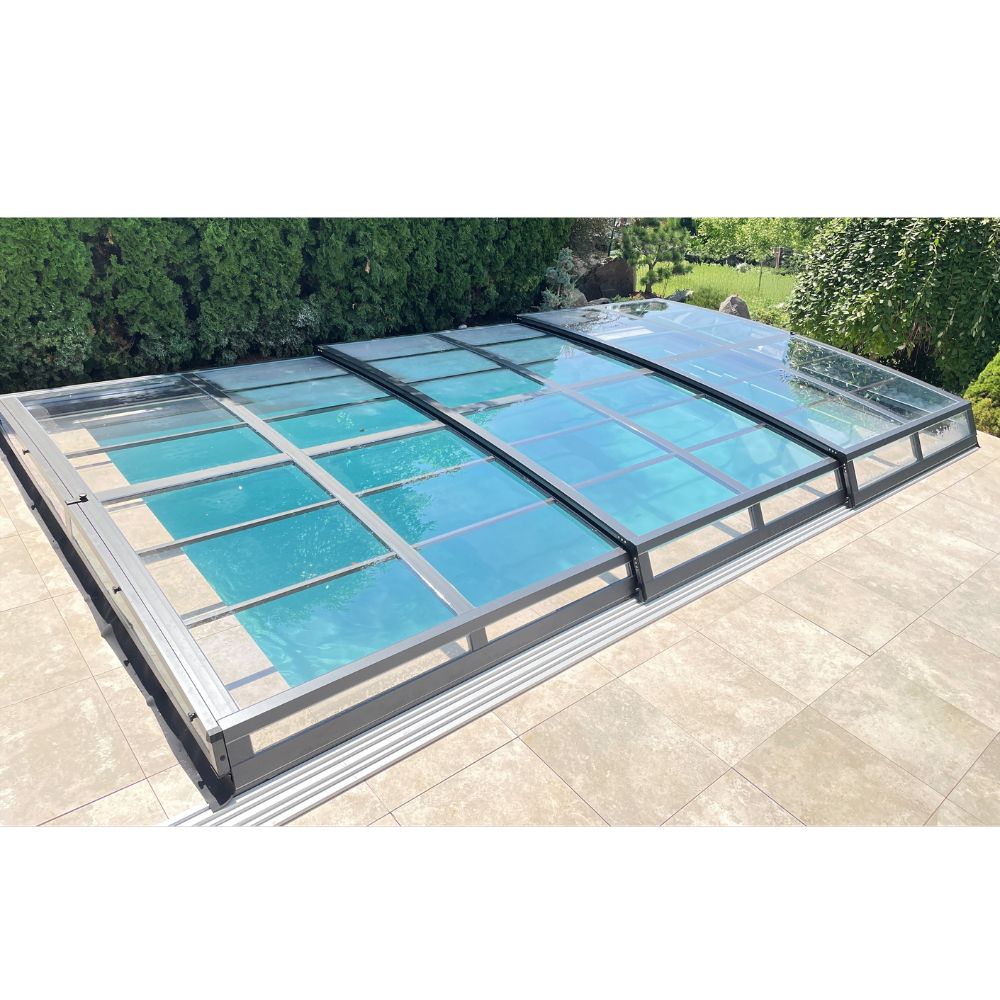 Vi tilbyder det i sølvfarve med anodiseret overfladebehandling. Mulighed for walk-on design, dobbeltsidet bevægelse og forlængelse af skinnen til at flytte taget ud af poolen.