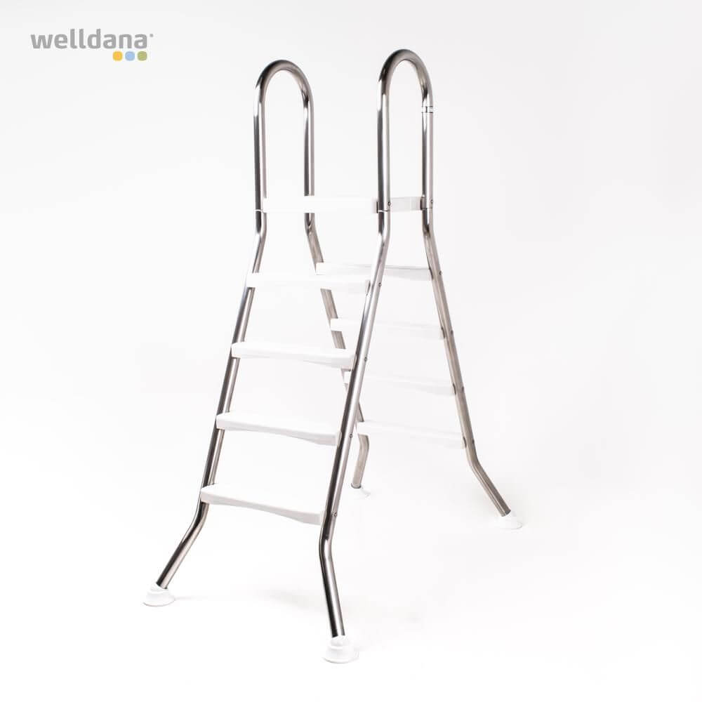 Denne fritstående stige fra Welldana® er designet til sikker og stabil adgang til fritstående pools. Stigen er fremstillet i klarpoleret rustfrit stål (Ø43 mm), hvilket sikrer høj styrke og lang levetid – selv i fugtige udendørsmiljøer.