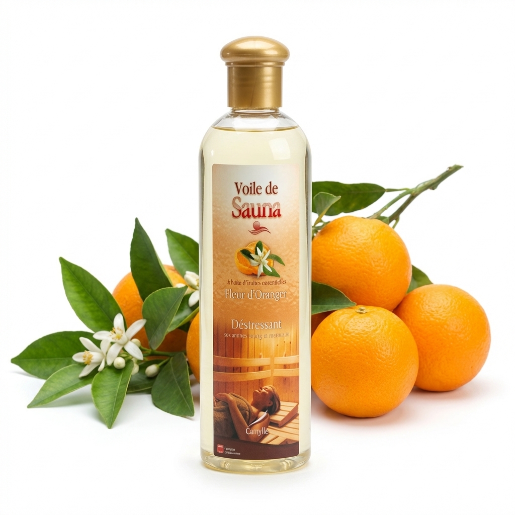 Voile de Sauna er helt opløselig i vand og diffunderer i generøse mængder, når den fortyndede opløsning hældes på ovnens varme sten (10 til 20 ml fortyndes i en liter vand).Duft: Orange Blossom
