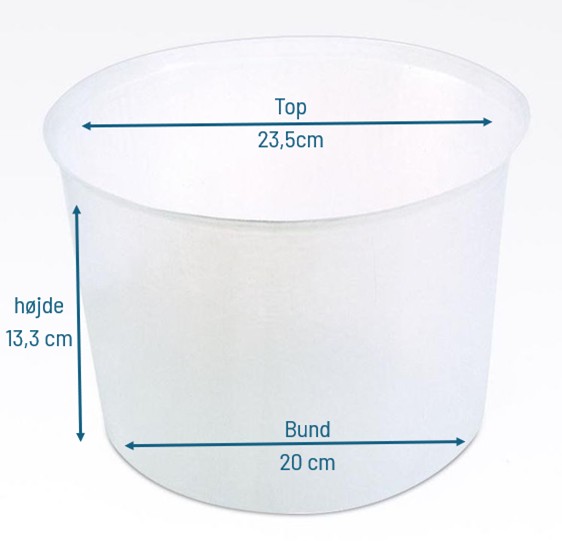 Diameter på 23,5 cm. en diameter på 20 cm i bunden og er 13,3 cm høj.